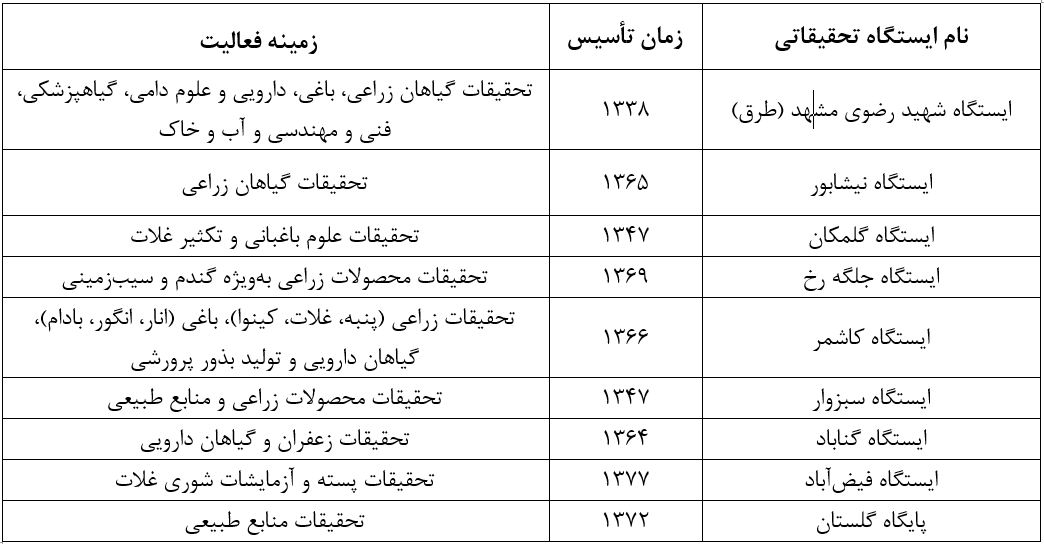 فعالیت تحقیقاتی این مرکز از سال 1338 با تشکیل اداره اصلاح و تهیه نهال و بذر آغاز شد. تحقیقات گیاه پزشکی نیز در سال 1342 در واحدی به نام آزمایشگاه بررسی آفات و بیماریهای گیاهی در ایستگاه کشاورزی طرق و در اراضی اداره اصلاح بذر شکل گرفت و در سال 1345 به ساختمان جدید انتقال یافت. در سال 1344 اداره خاک شناسی در ایستگاه کشاورزی طرق تشکیل شد و با مشاوره کارشناسان خارجی، تحقیقات خود را در مورد مسائل خاکشناسی با امکانات کافی شروع نمود. این واحدهای تحقیقاتی سه گانه و نیز واحد تحقیقات چغندرقند که در قالب یک آزمایشگاه در سال 1344 در ایستگاه کشاورزی طرق قرار داشت، از نظر برنامه فعالیت و استخدام زیر نظر موسسات تحقیقات مادری بودند و از نظر اداری توسط اداره کل کشاورزی سابق اداره می شدند. علاوه بر این، اداره های جنگل و مرتع و دامپروری با سابقه زیاد تحقیقاتی و اجرایی و با وضعیتی نسبتا مستقل در استان خراسان فعالیت گسترده ای داشتند.